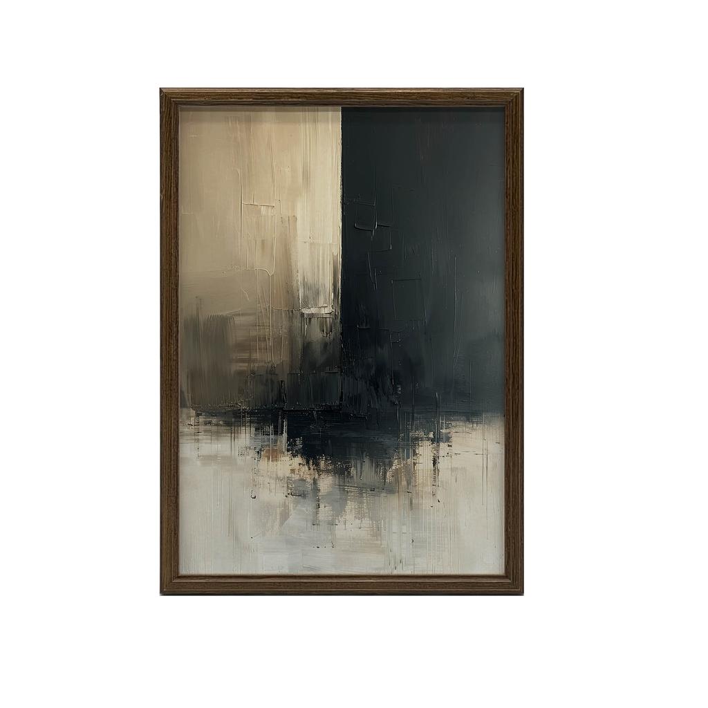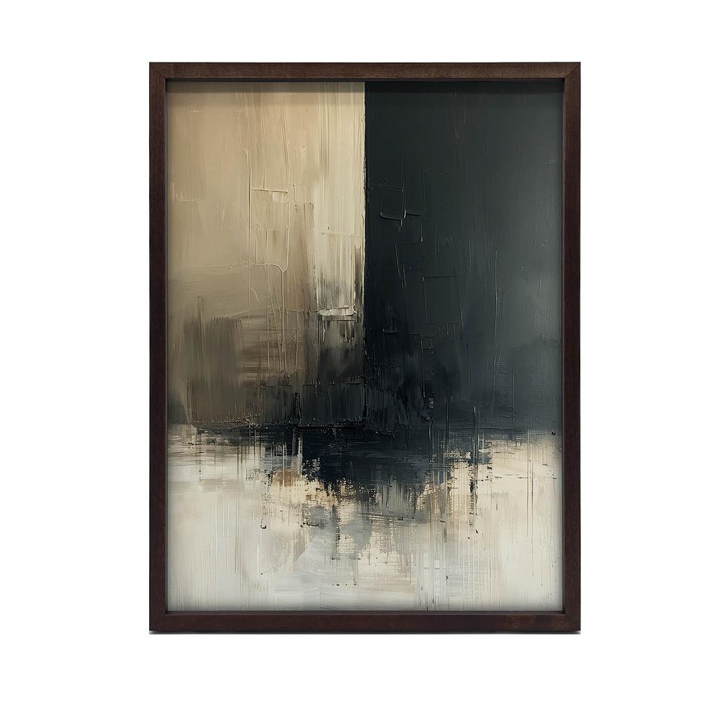 Tak, plakat ‘Subtelna Równowaga’ jest oprawiony w elegancką, ciemnobrązową ramę, która doskonale komponuje się z projektem i wnosi do przestrzeni wyjątkowy, luksusowy charakter.