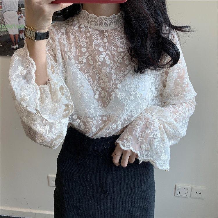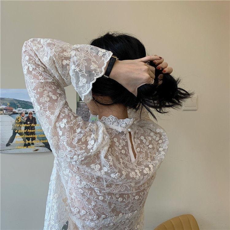 Женский кружевной свитер с высоким воротником и расклешенными сетчатыми рукавами
