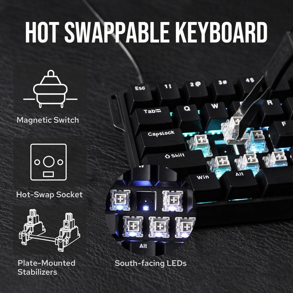 ПРОЧНАЯ КОНСТРУКЦИЯ И КЛАВИШИ С ВОЗМОЖНОСТЬЮ ГОРЯЧЕЙ ЗАМЕНЫ: Серия AULA WIN68 HE оснащена прочной металлической позиционирующей пластиной для повышенной долговечности и стабильности.. Он обладает функцией полной горячей замены клавиш и совместим с магнитными переключателями с южной ориентацией.. Не требует пайки, легко заменять переключатели. Попробуйте разные магнитные переключатели Холла, чтобы найти лучшие ощущения от нажатия клавиш и отзывчивость.