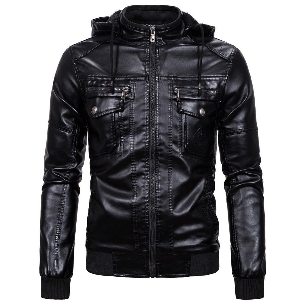 Кожаная куртка с подкладкой, мужская зимняя утолщенная теплая съемная куртка из искусственной кожи с капюшоном, байкерская куртка