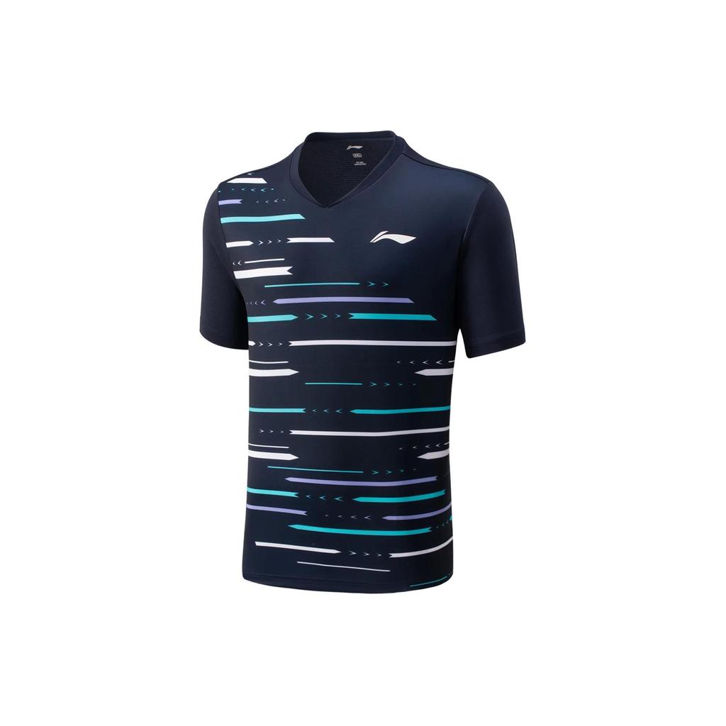 Футболка Li Ning Badminton Series в полоску с V-образным вырезом, спортивная, с коротким рукавом, унисекс, цвет чернильно-синий AAYU155-1