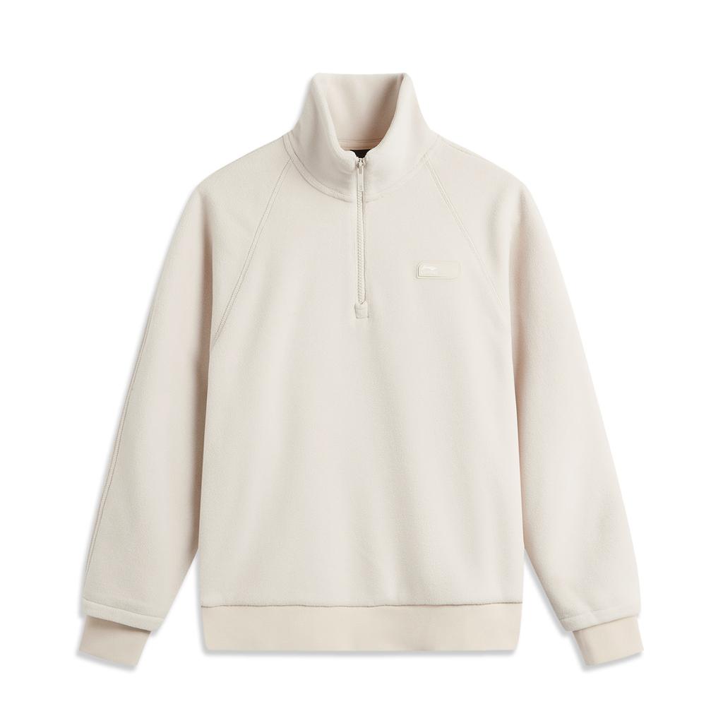 Li-Ning Женский свитер с воротником-стойкой, однотонный флис, теплый, свободный, с длинным рукавом, реглан, овсяно-серый AWDU892-1