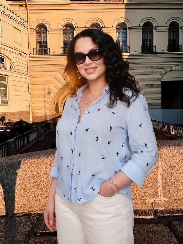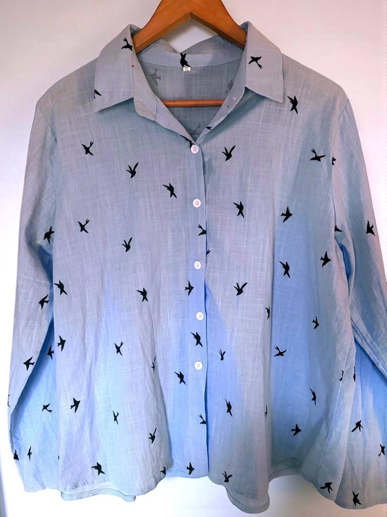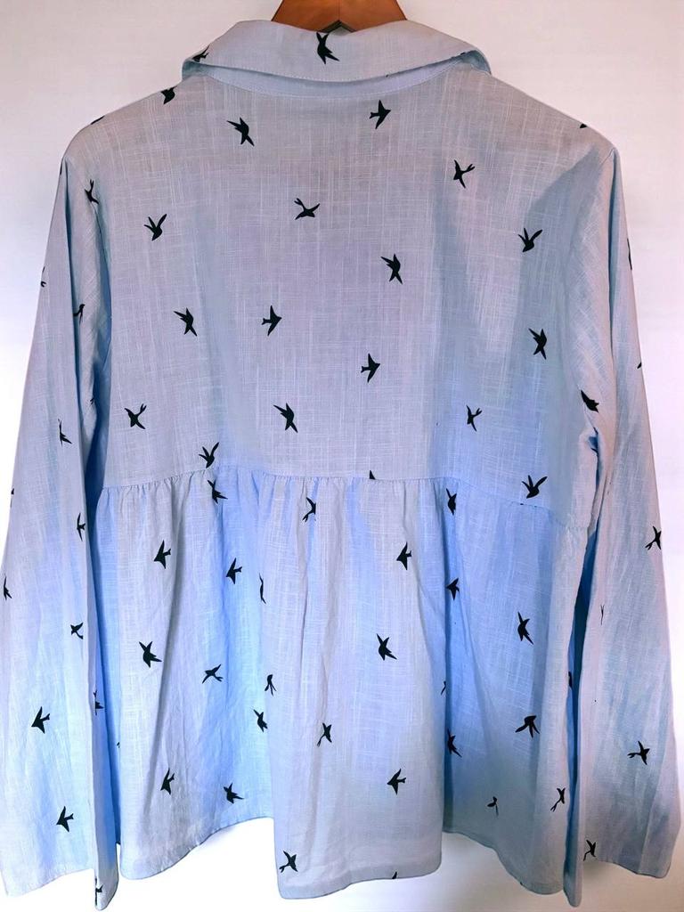 Это рубашка не про красоту или моду, а про комфорт. В комментариях её кто-то сильно хвалит, кто-то грозится выкинуть. Я буду хвалить. Да, у неё ужасный фасон, выточек толком нигде нет, на спине непонятная сборка. Но ткань замечательная: тонкий, мягкий хлопок. В жару в ней просто отлично. Лёгкая, свободная, продуваемая. Она просвечивает, но не критично. Это не первая моя рубашка этого фасона. Первая была чёрная, без рисунка. Так вот, ткань там тоже хлопок, но более плотный, не очень приятный. Рубашки немного маломерят и после стирки садятся.