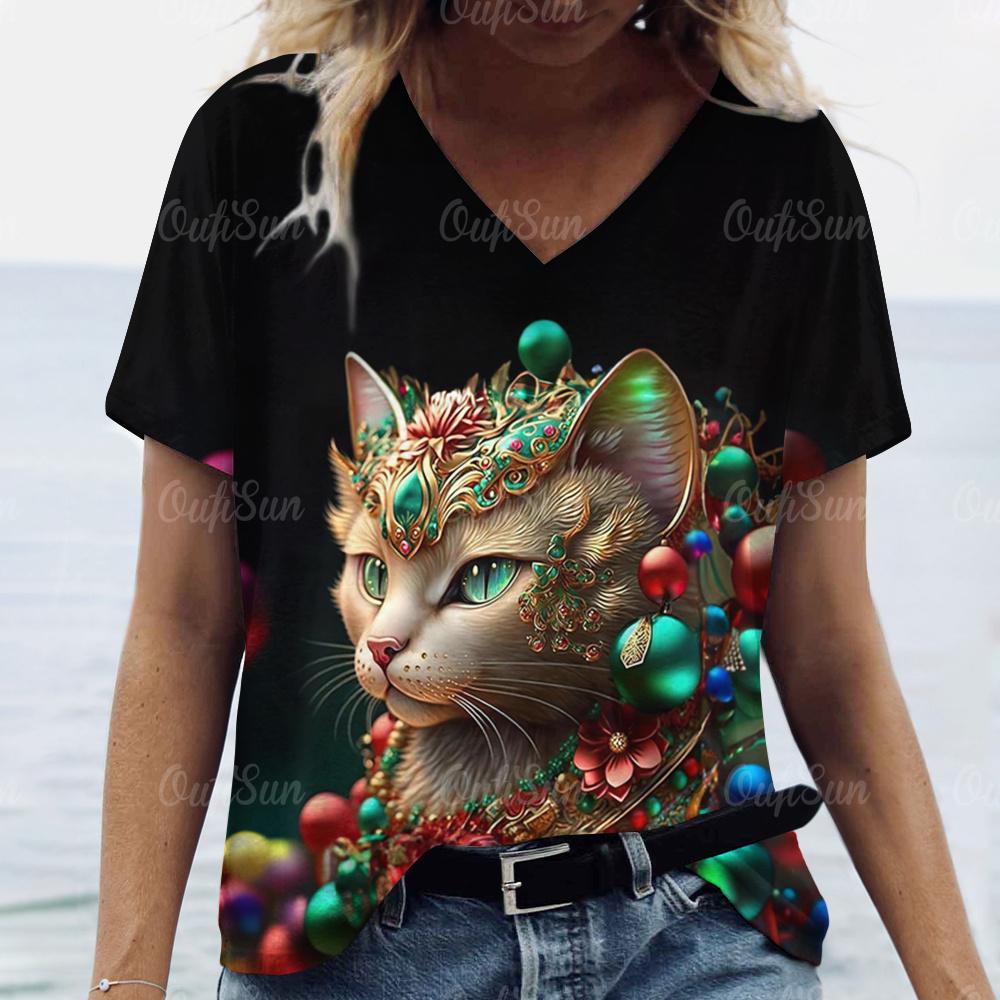 Футболка с принтом 3D-кота для женщин, повседневные футболки с коротким рукавом и V-образным вырезом, свободная одежда, милые топы для женщин — купить товар онлайн с бесплатной доставкой до всему миру!