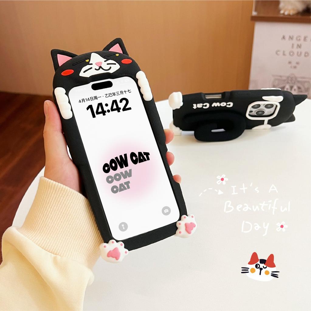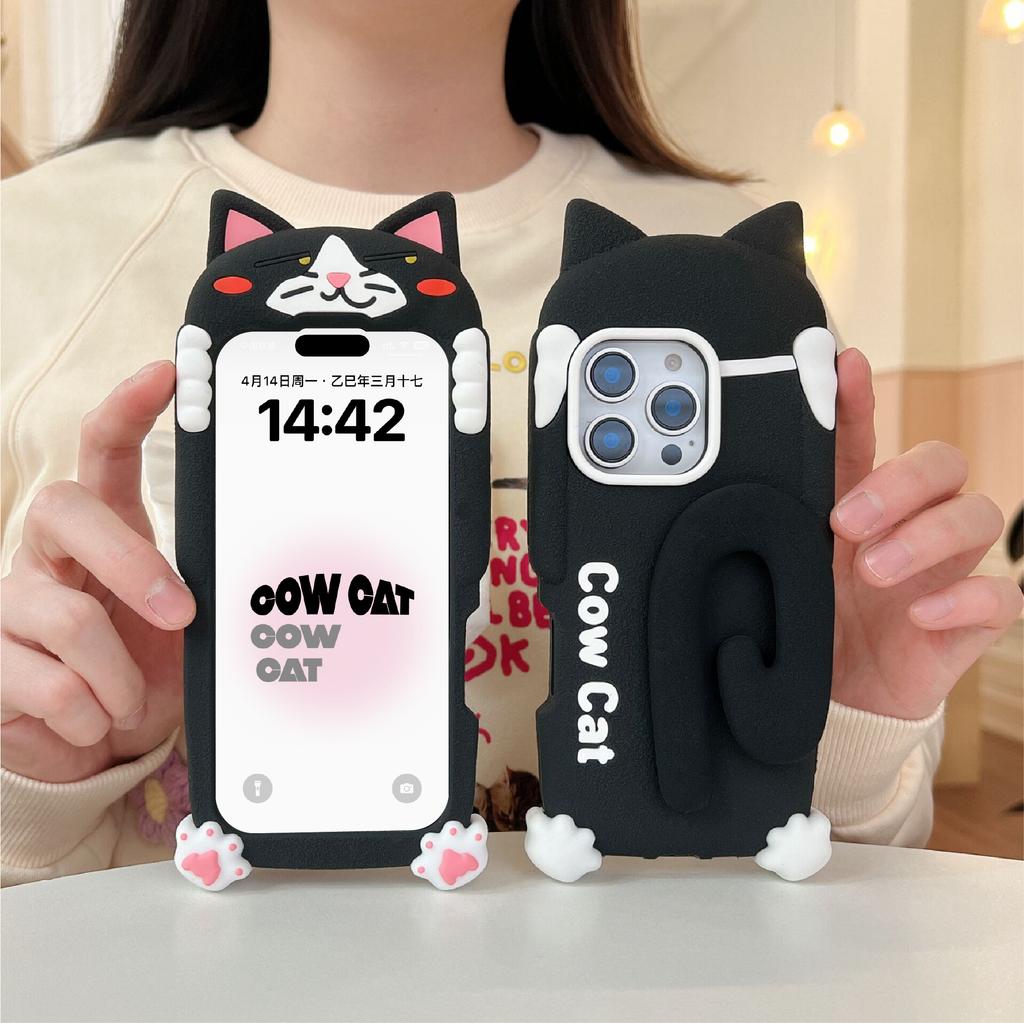 For iPhone 16 Pro Max Silicone Case Cow Cat Tail Kickstand Anti Drop Phone Back Cover