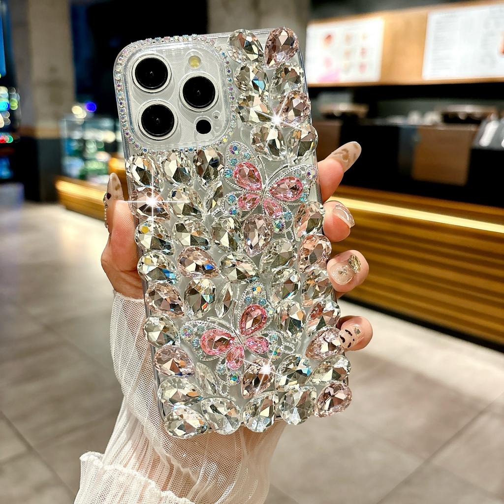For iPhone 16 Pro Case Glass Rhinestone Two Butterfly Decor TPU Phone Back Cover — купить товар онлайн с бесплатной доставкой по всему миру!