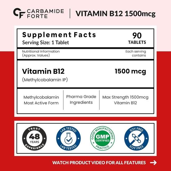 Carbamide Forte Vitamin B12 Tablets 1500 mcg -Active form of Methylcobalamin Vitamin B12 Supplements for Men & Women- 90 Veg Tablets