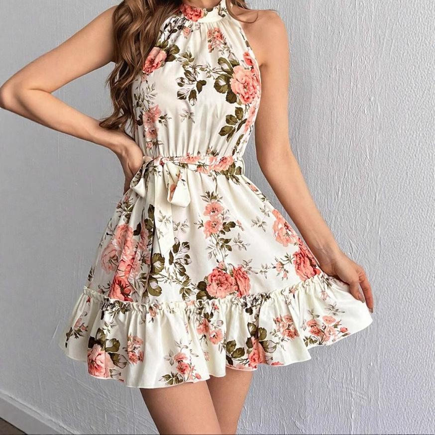 Женское летнее платье без рукавов с воротником-стойкой и цветочным принтом