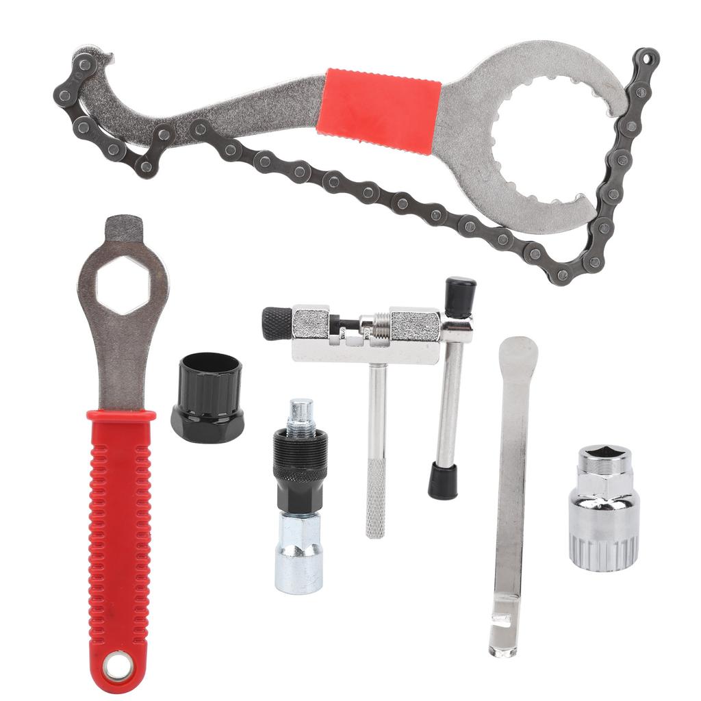1 x Цепной ключ1 x 16 мм шестигранный ключ1 x Выжимка цепи1 x Съемник каретки1 x Съемник шатунов 1 x Съемник роторной трещотки1 x БортировкаВысококачественная сталь стабильна и долговечна, помогает экономить энергию, использовать с ключом, подходит для шатунов горного велосипеда, для разборки шатунов, прост в эксплуатации, очень подходит для обслуживания велосипеда.