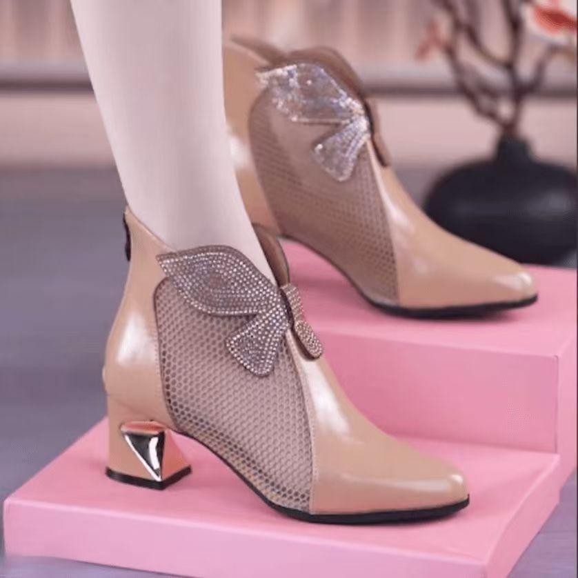 Женские летние босоножки 2025 года, ботильоны с бантом и стразами, мягкая подошва, острый нос, толстый каблук, модные сетчатые туфли — купить товар онлайн с бесплатной доставкой по всему миру!