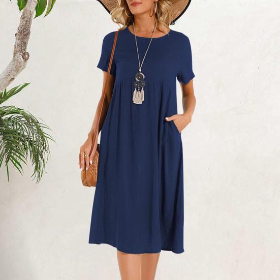 Элегантный круглый вырез горловины: Украсьте свой гардероб нашим платьем с классическим круглым вырезом и короткими рукавами.. Фасон пуловера и длина до колена создают простой, но изысканный образ, подходящий для разных случаев.