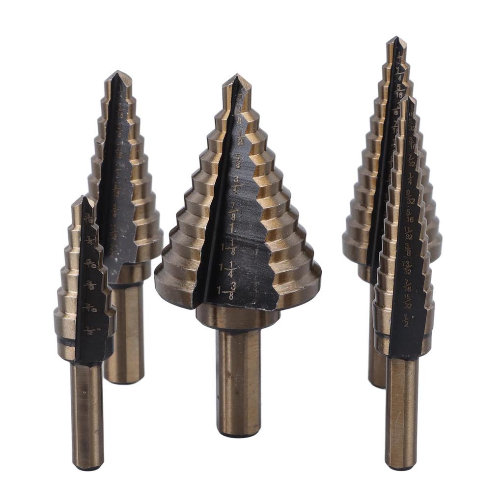 5 x Ступенчатое сверло5 шт. Набор: Этот набор ступенчатых сверл включает 5 штук, со спецификациями от 14 дюймов до 1?38 дюймов, от 316 дюймов до 78 дюймов, от 14 дюймов до 34 дюймов, от 18 дюймов до 12 дюймов, от 316 дюймов до 12 дюймов, обеспечивая универсальность для различных потребностей сверления.
