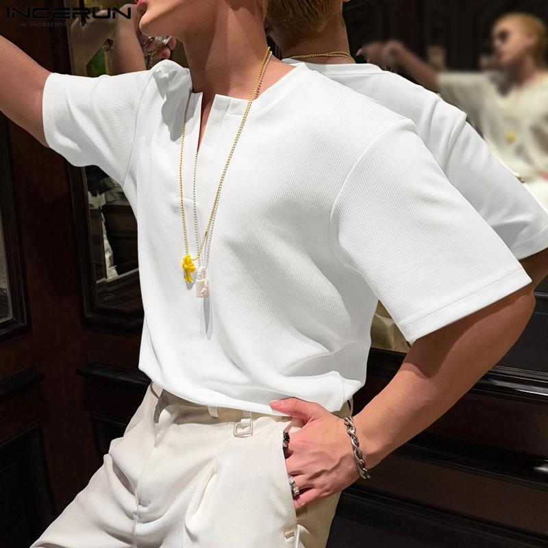 INCERUN Летние мужские футболки с V-образным вырезом, с коротким рукавом, текстурные, повседневные