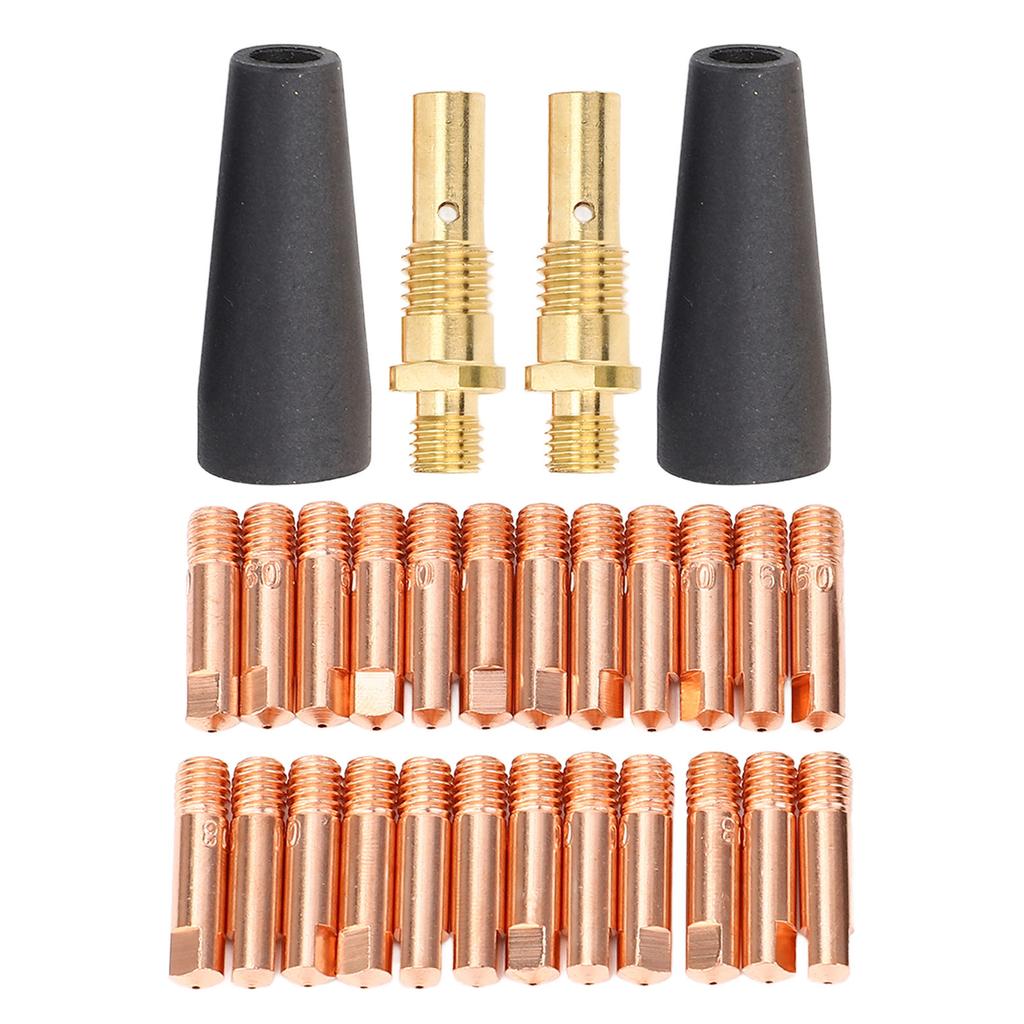 Внимательно проверьте размеры деталей, чтобы убедиться, что они подходят для вашего сварочного аппарата. Включенные детали: В этот сварочный комплект входят 24 наконечника электродов диаметром 0,031 дюйма, 2 сопла с флюсовым сердечником для безгазовой сварки и 2 газовых диффузора, что обеспечивает полный набор для различных сварочных задач.