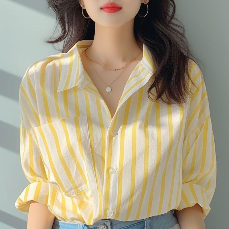 Женская полосатая рубашка желто-белая Весенне-осенняя рубашка Повседневная Эффектная С длинным рукавом
