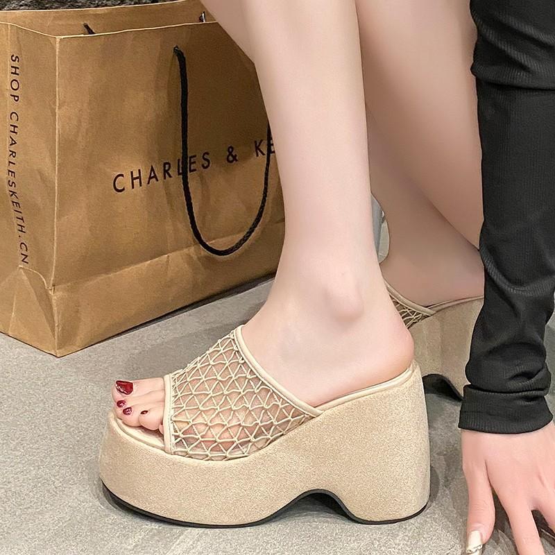 Тапочки с покатым каблуком, кружевной сеткой, в одну линию, летние туфли с открытым носком, утягивающие, классные тапочки с толстой подошвой