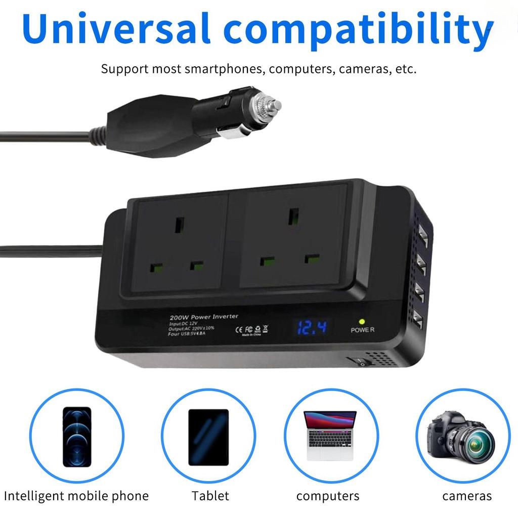 Модифицированная синусоида: Преобразует 12 В постоянного тока в переменный ток 220 В бытовой настенный источник питания с непрерывным выходом 200 Вт с 2 розетками переменного тока, одним светодиодным дисплеем напряжения, четырьмя интерфейсами USB и одним светодиодным рабочим индикатором. (Пожалуйста, убедитесь, что общая номинальная мощность подключенных устройств составляет ≤200 Вт).
