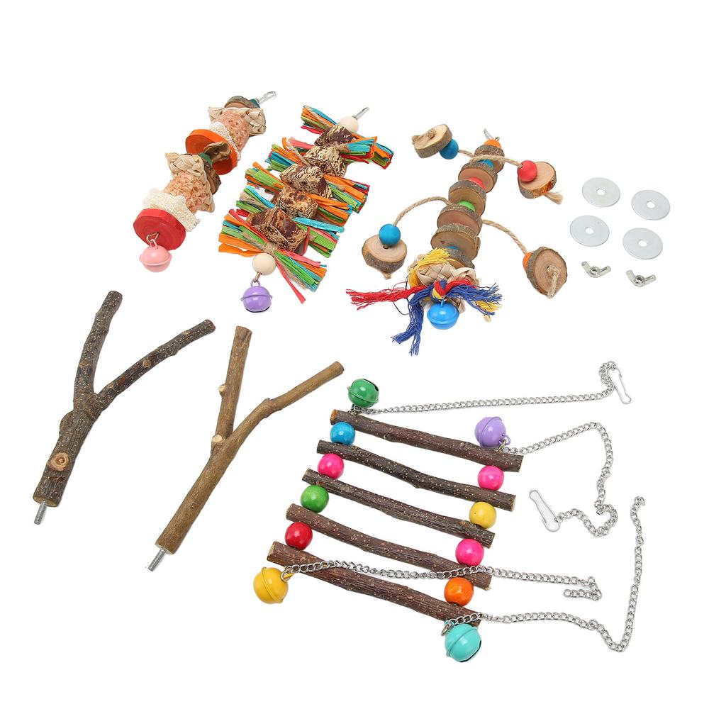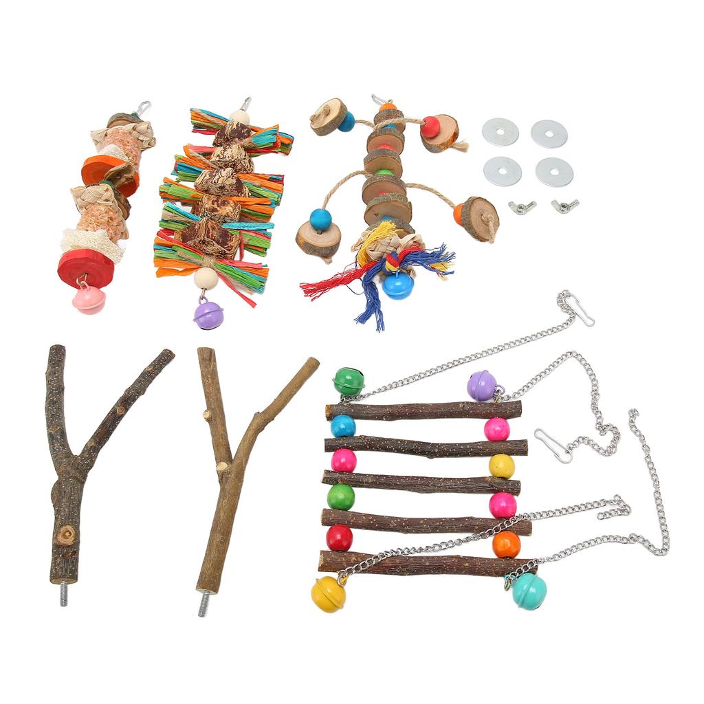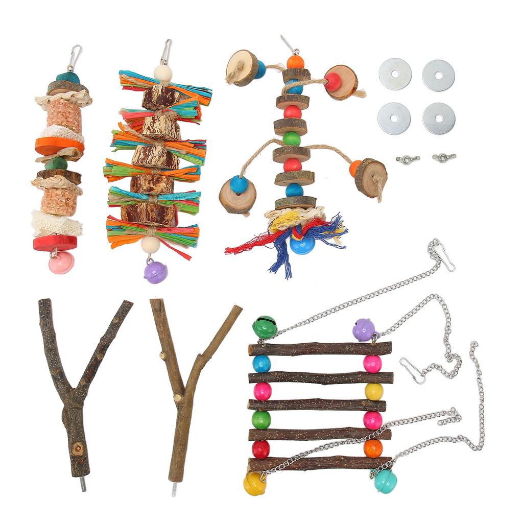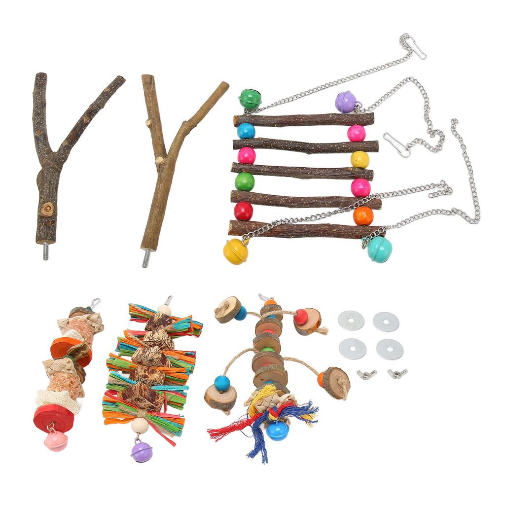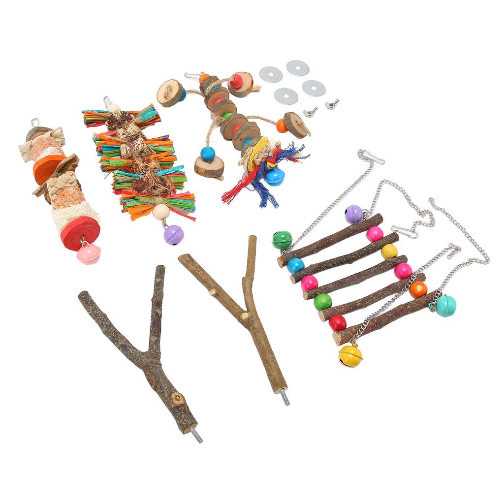 5. Полный комплект: Включает различные типы развлекательных игрушек для птиц, жевательные веревки x 3, подставки-вилки x 2, качели x 1, прокладки x 4, барашковые гайки x 2.