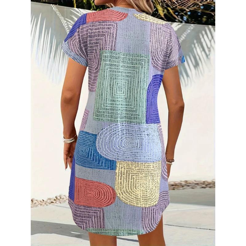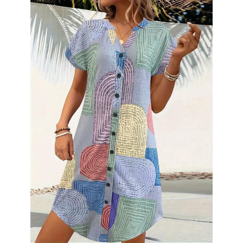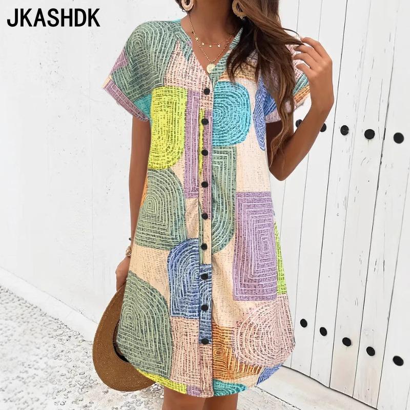 JKASHDK Женская мода лето весна цвет блок принт короткий рукав V-образный вырез свободная талия повседневные платья