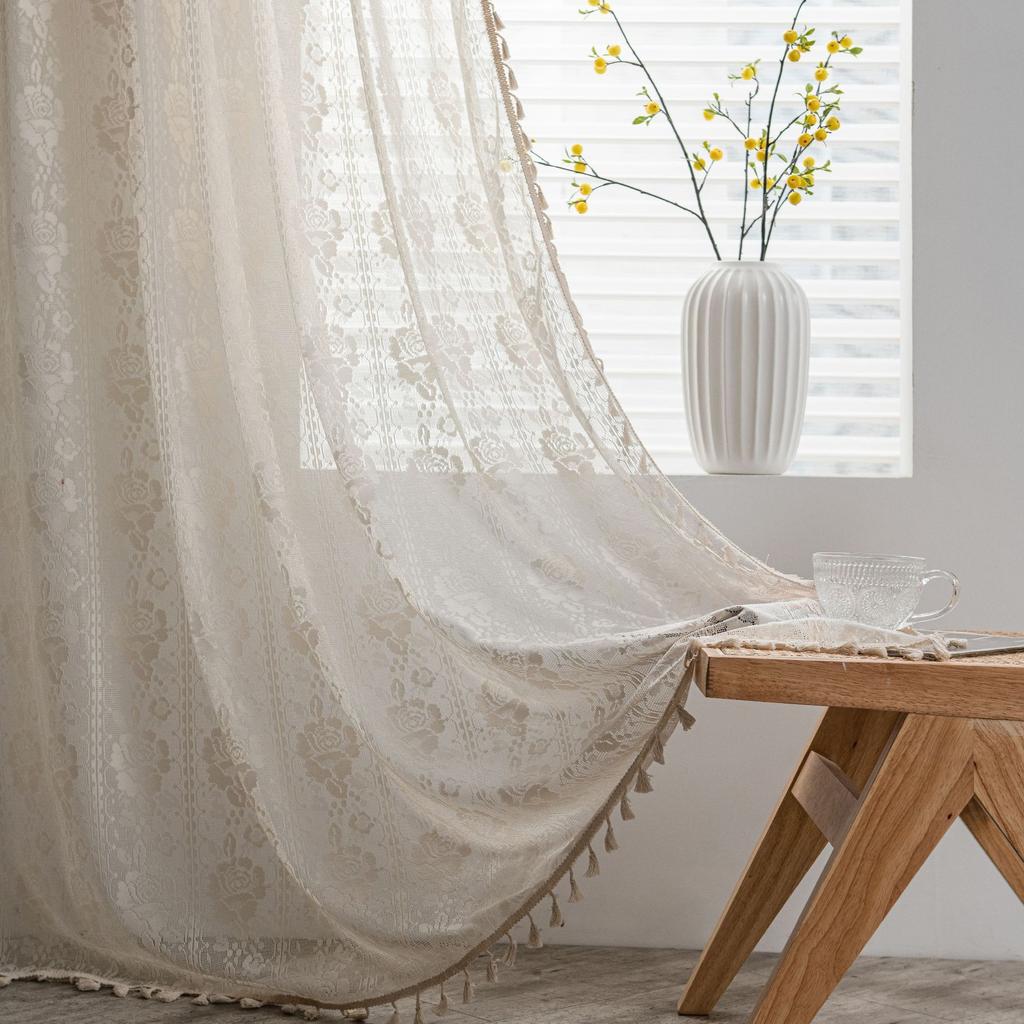 Бохо-шик жаккардовый полиэстер полупрозрачный карниз для штор на штанге для спальни, богемный ажурный дизайн крючком кружева, беспроводная защита окна от посторонних глаз