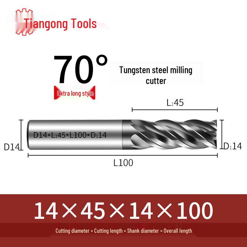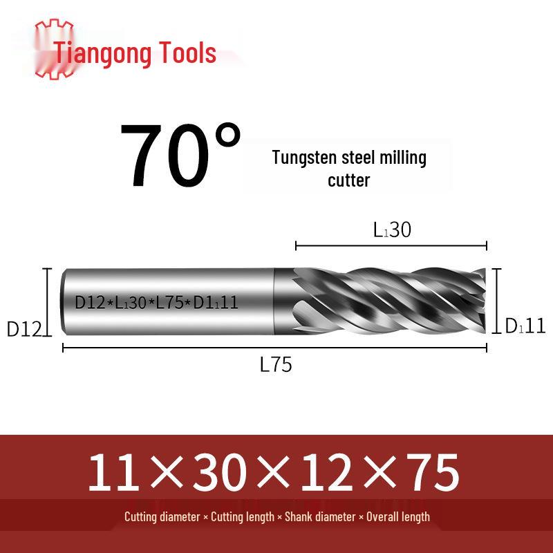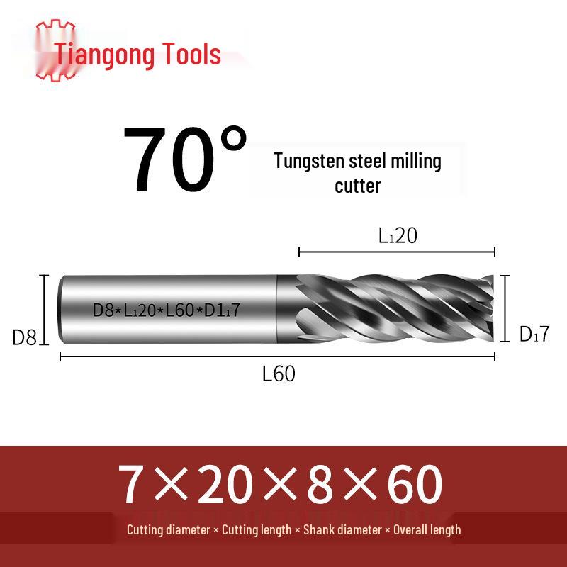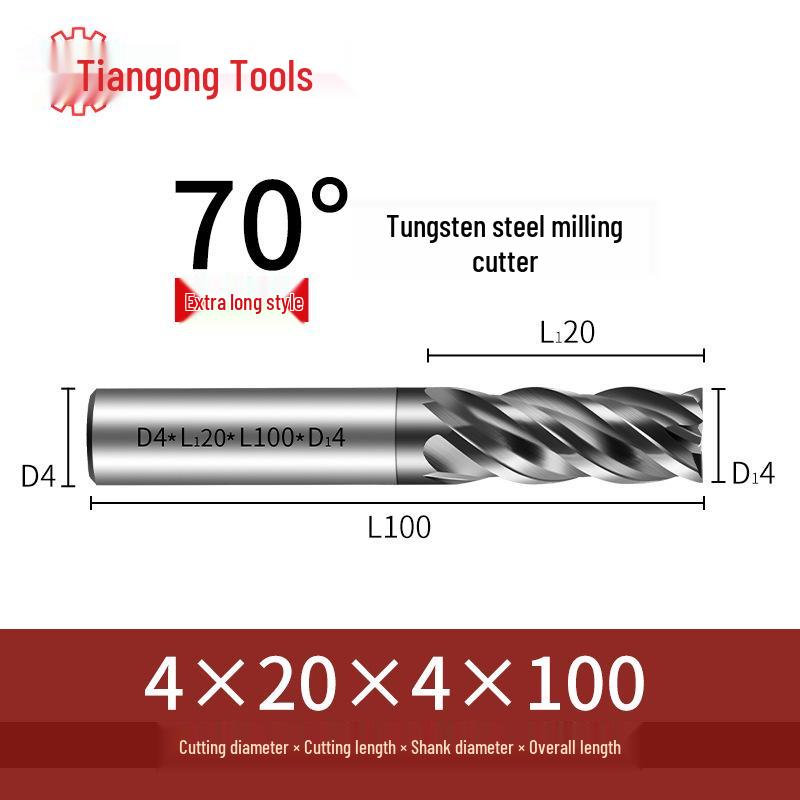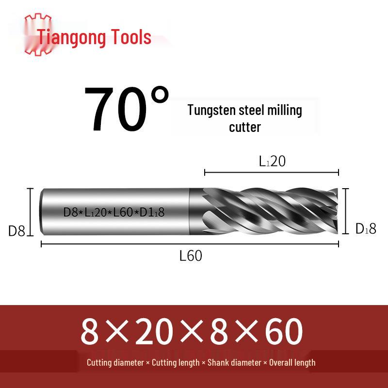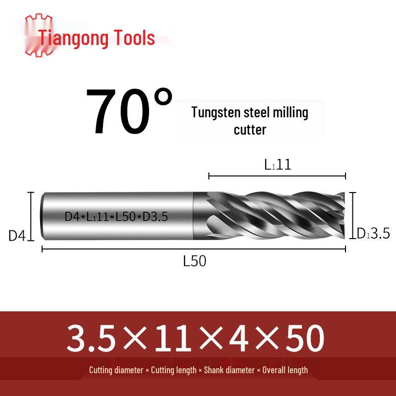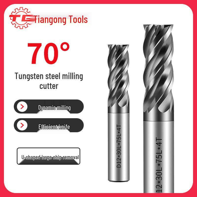 Tiangong 70° Твердосплавная концевая фреза с ЧПУ: Высокоточная, Виброустойчивая, Плоское дно, Четырехлезвийная фреза для нержавеющей стали.