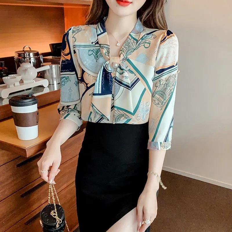 Весенне-летняя рубашка с темпераментным дизайном, блузка с длинным рукавом, блузка с рукавом три четверти, шифоновая рубашка с принтом, женская одежда