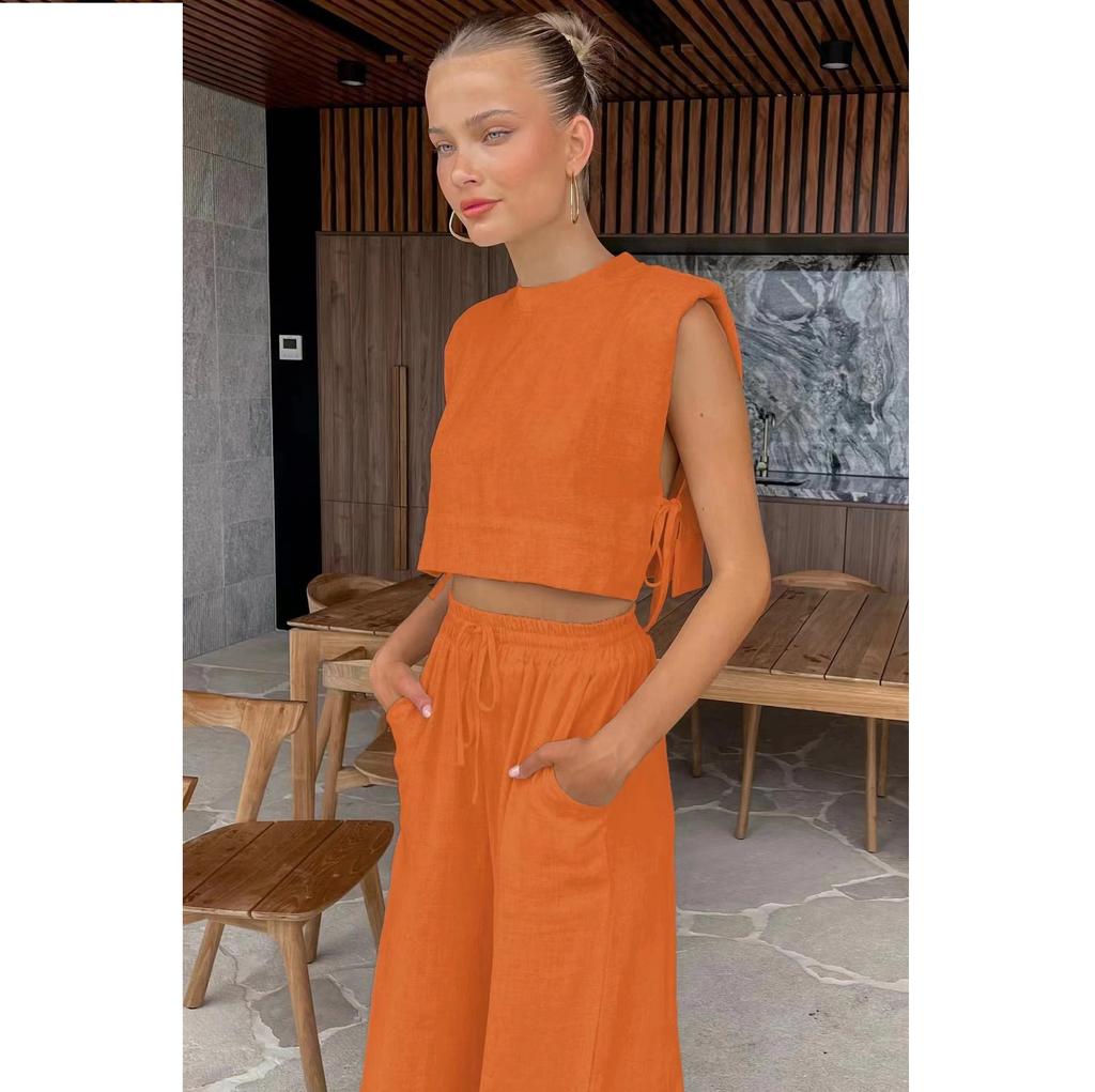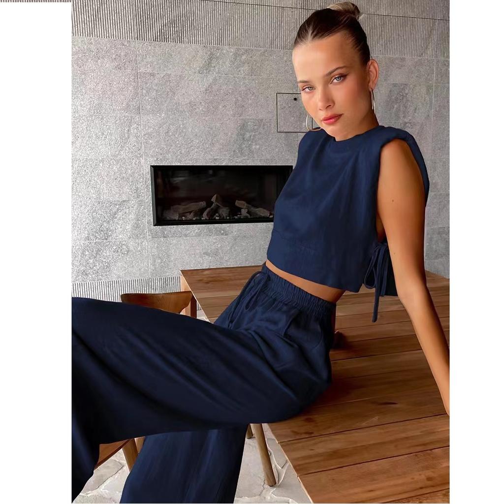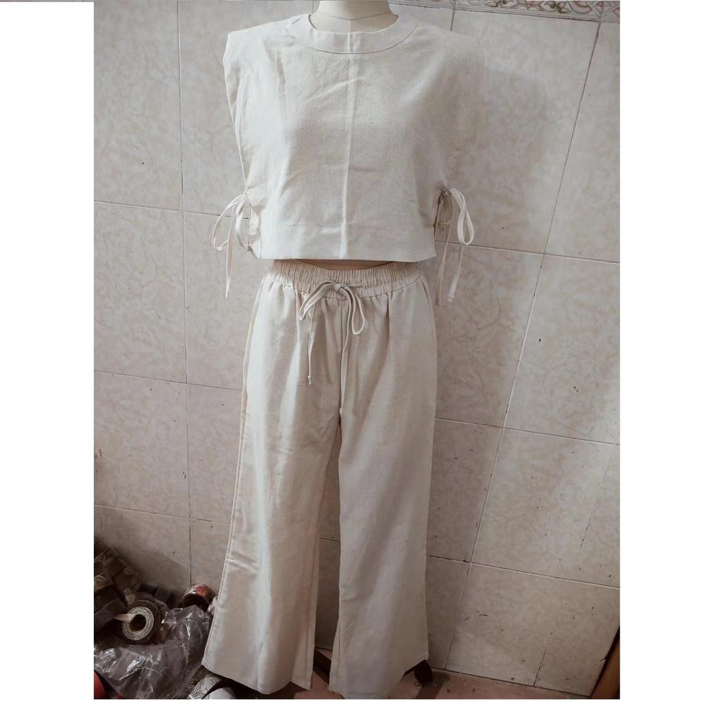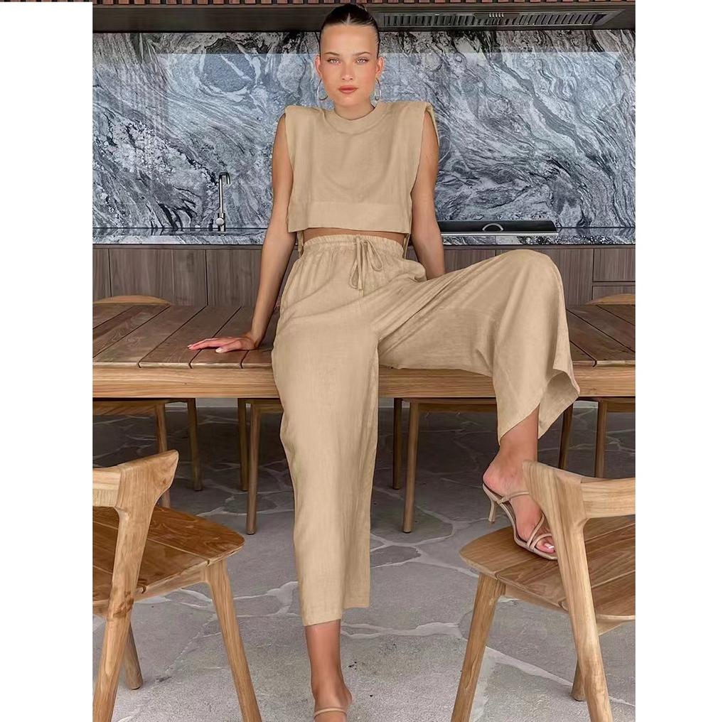 Модный комплект из хлопка и льна с подплечниками и безрукавкой, а также широкие брюки из хлопка и льна с карманами, комплект из двух предметов для женщин