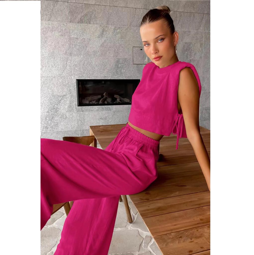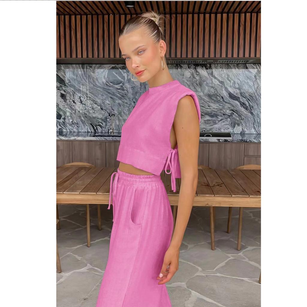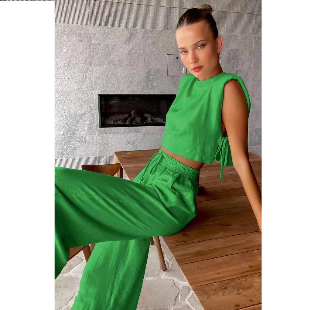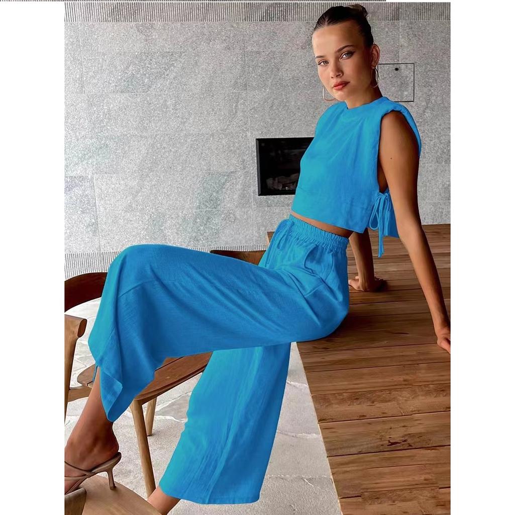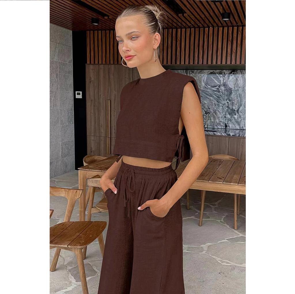 Модный комплект из хлопка и льна с подплечниками и безрукавкой, а также широкие брюки из хлопка и льна с карманами, комплект из двух предметов для женщин
