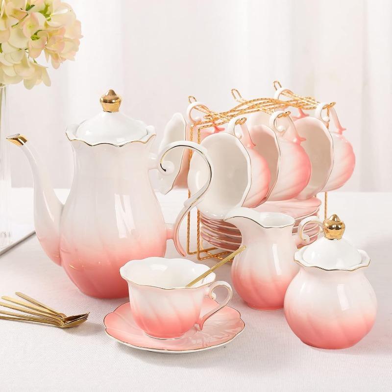 22 pcs Porcelain Tea Set for 6, Luxury British Style Tea/Coffee Cup Set with Golden Trim, Beautiful Tea Set for Women — купить товар онлайн с бесплатной доставкой по всему миру!