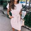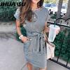 IHUASU Женская мода лето весна однотонный принт с коротким рукавом и круглым вырезом с высокой талией повседневные платья