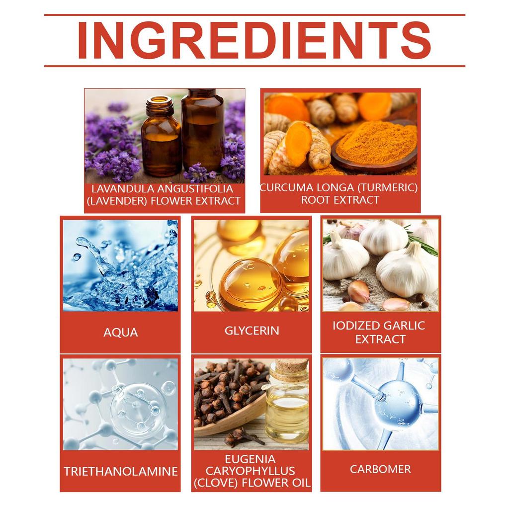 ВОДА, ГЛИЦЕРИН, КАРБОМЕР, ТРИЭТАНОЛАМИН, КУРКУМА ДЛИННАЯ (КУРКУМА) ЭКСТРАКТ КОРНЯ, ЛАВАНДУЛА АНГУСТИФОЛИСТНАЯ (ЛАВАНДА) ЭКСТРАКТ ЦВЕТОВ, ЭКСТРАКТ ЙОДИРОВАННОГО ЧЕСНОКА, EUGENIA CARYOPHYLLUS (ГВОЗДИКА) ЦВЕТОЧНОЕ МАСЛО