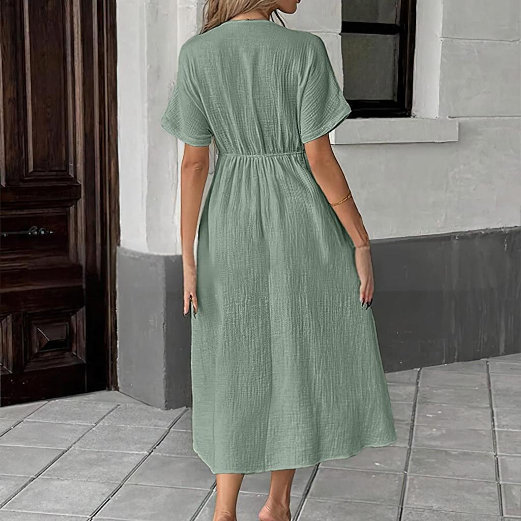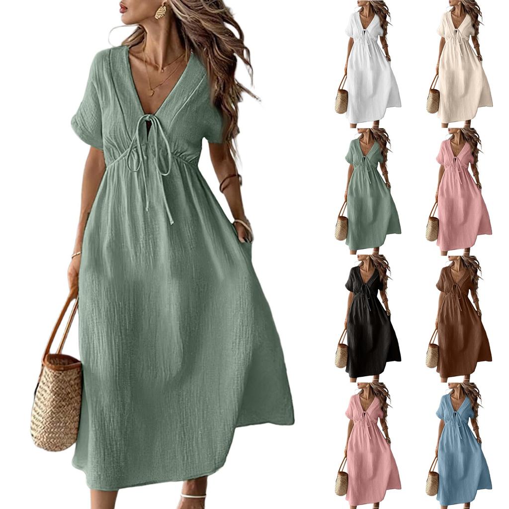 Женское свободное повседневное платье с V-образным вырезом и короткими рукавами, удобное однотонное платье с эластичной талией