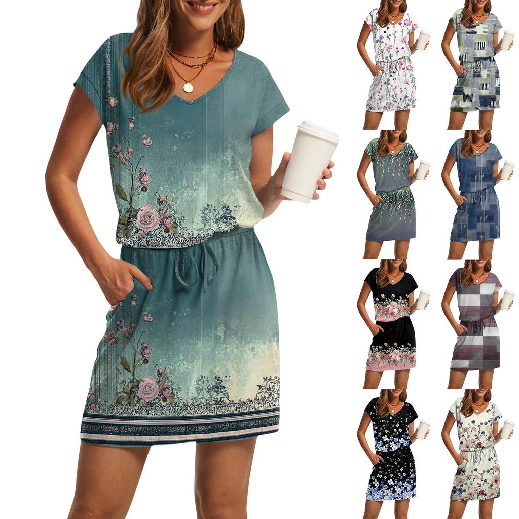 Женские модные повседневные платья с V-образным вырезом и коротким рукавом, на завязках и карманах с принтом