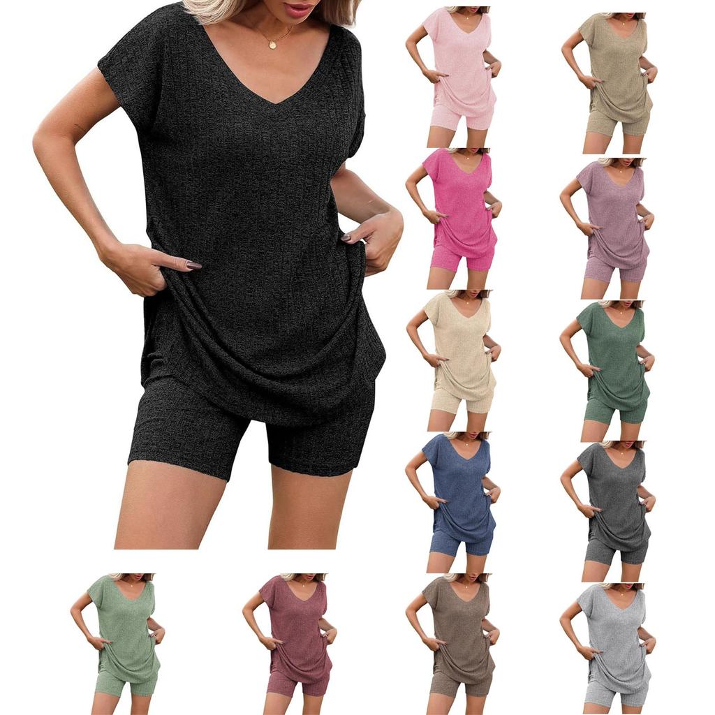 Женский летний комплект из двух частей с шортами, трикотажный домашний спортивный костюм с V-образным вырезом — купить товар онлайн с бесплатной доставкой по всему миру!