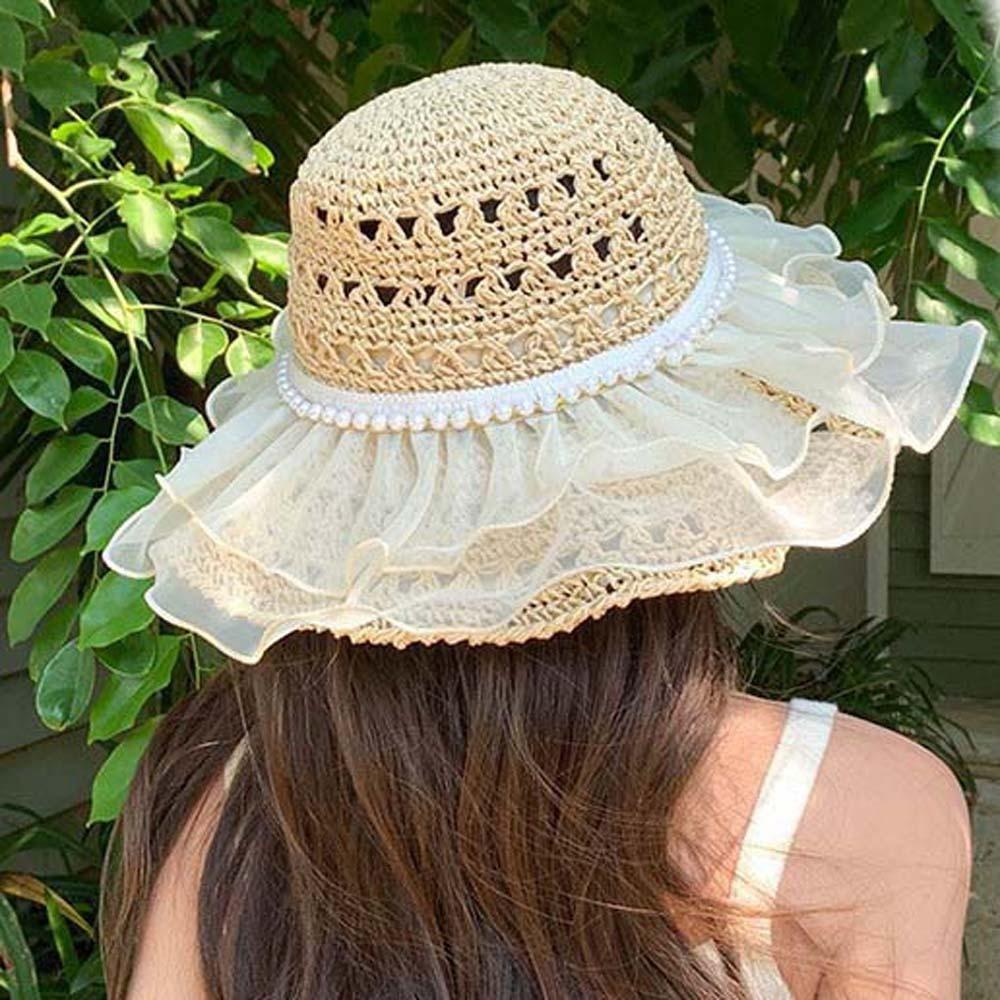 Кепка от солнца с ажурным кружевом и жемчужинами, дышащая, с большими полями, плетеная соломенная пляжная шляпа для женщин