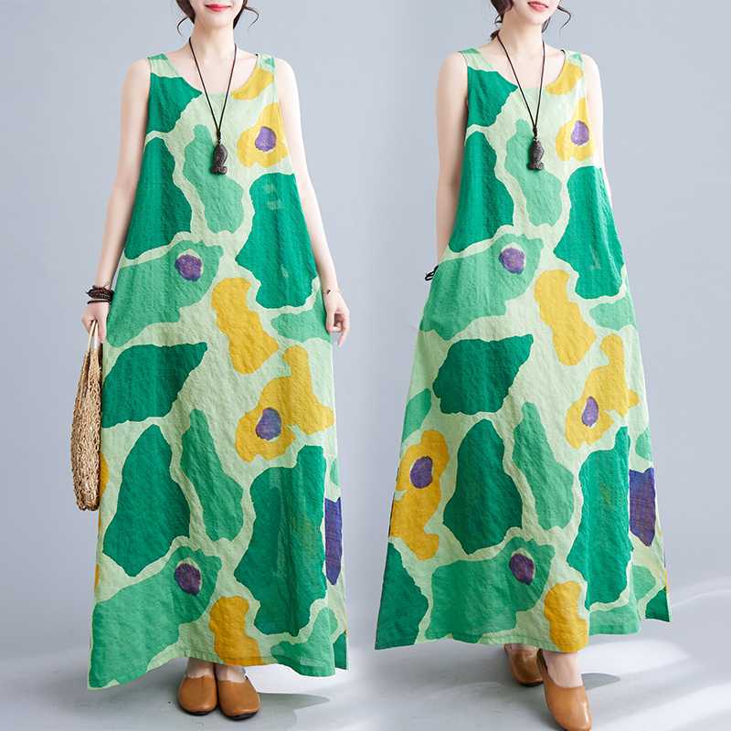 Летнее свободное платье без рукавов из хлопка и льна с принтом