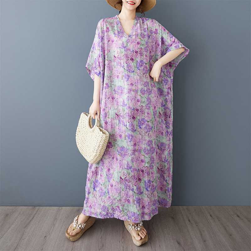 Летнее платье с цветочным принтом в стиле отпуска и V-образным вырезом в стиле ретро, длинное, чтобы скрыть тело, платье из хлопка и льна — купить товар онлайн с бесплатной доставкой по всему миру!