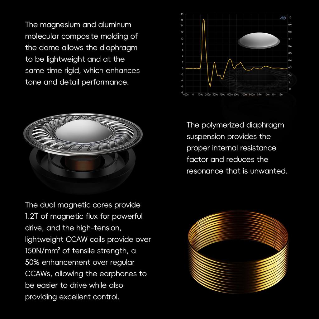 Наушники оснащены магниево-алюминиевой композитной диафрагмой для легкого, но надежного звучания, улучшающей детализацию и чистоту звука.. Полимерный подвес минимизирует нежелательный резонанс, а двойной магнитный сердечник обеспечивает 1,2 Тл потока для мощного привода.. Высоконатяжные катушки CCAW имеют на 50% более высокую устойчивость к растяжению, чем стандартные CCAW, что обеспечивает легкую управляемость и превосходный контроль.