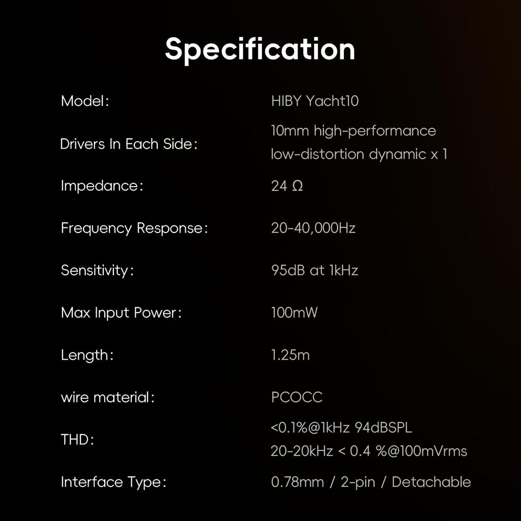 В основе наушников-вкладышей Yacht10 лежит высокопроизводительный динамический динамик диаметром 10 мм, с коэффициентом нелинейных искажений + шум менее 0,4% во всем частотном диапазоне 20-20 кГц, и всего 0,045% и 0,098% на 500 Гц и 1 кГц соответственно.