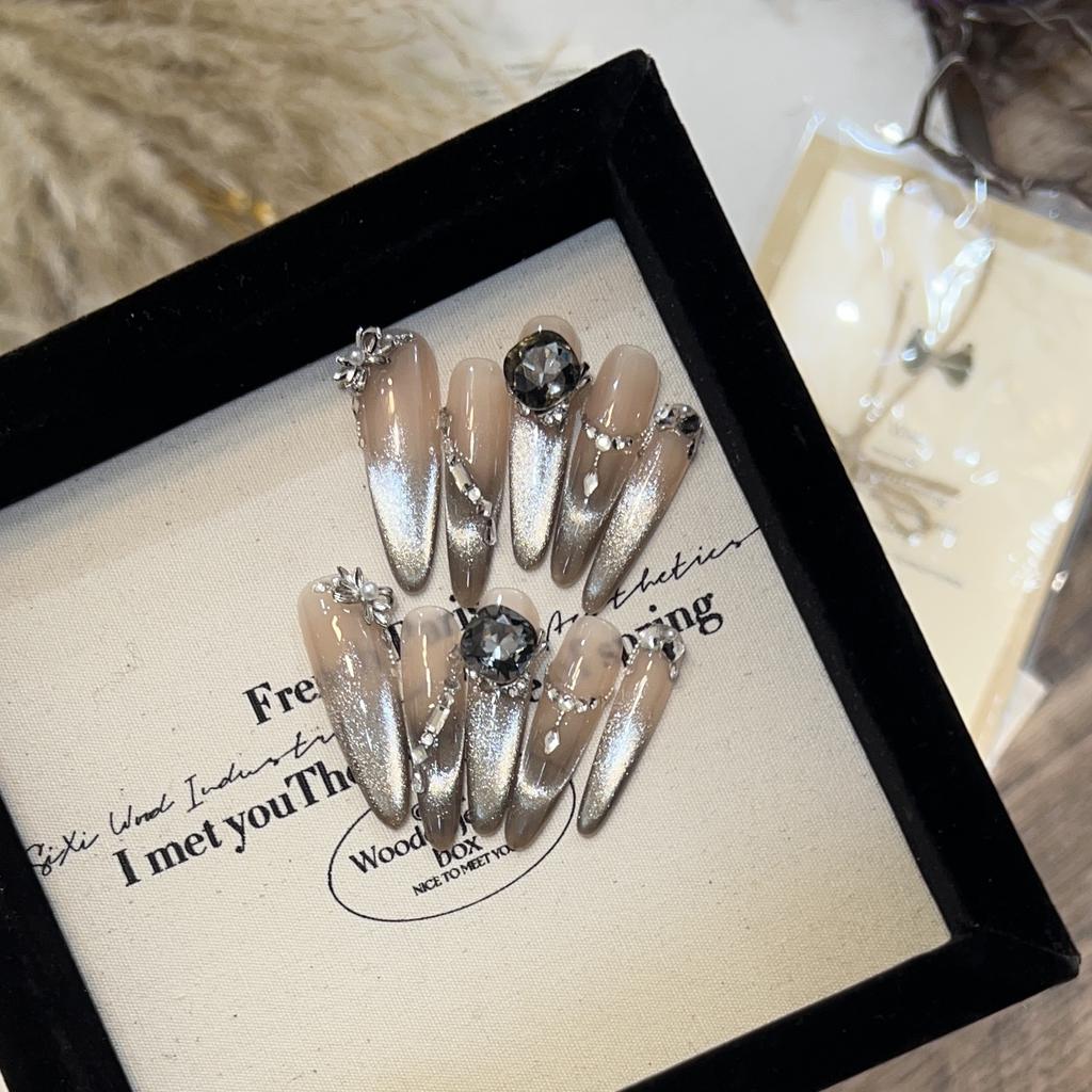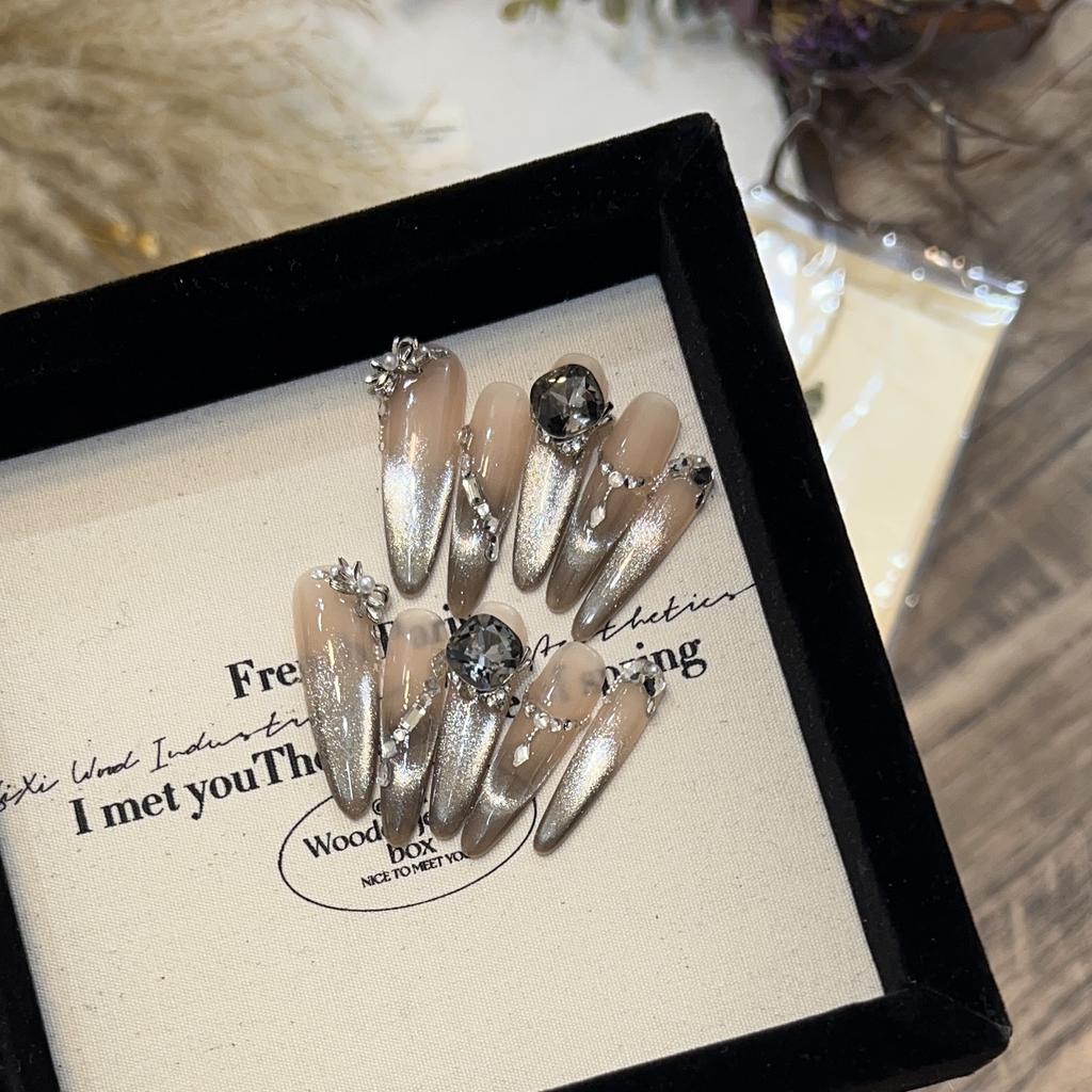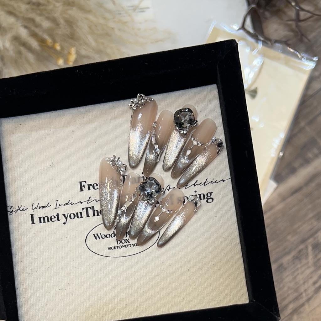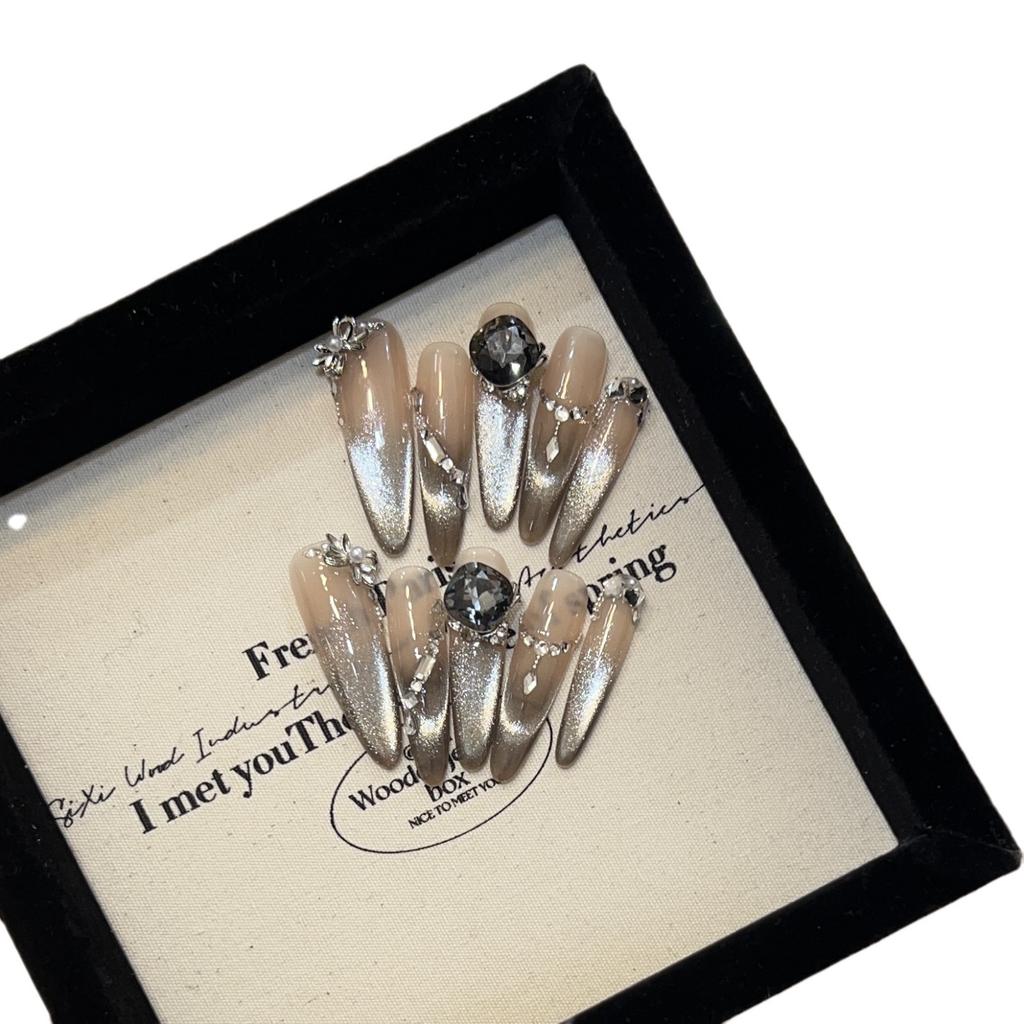 Взрывной Черный Бриллиант Французский Кошачий Глаз Носить Броню Ручной Работы Телесный Цвет Градиент Французский Маникюр с Битым Бриллиантом Съемная Накладная Ногтевая Пластина