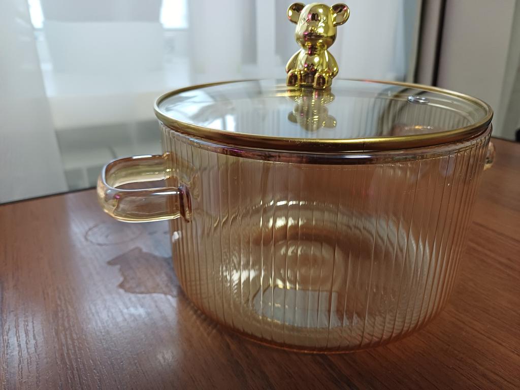 Если честно ожидала большего! Кастрюлька, маленькая ( ну это я такой размер может выбрала). Но стекло тонкостенное, у крышки ободок как будто чуть толще фольги. Завтра попробую поставить на огонь! Оооочень боюсь, вдруг треснет! Запись и отзыв позже.