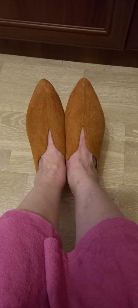 Балетки на ноге смотрятся хорошо,.мягкая стелька,удобны в носке. Мой размер 38,а купила 39,но поскольку нога не широкая,нужно было брать свой размер, а так несколько свободны.