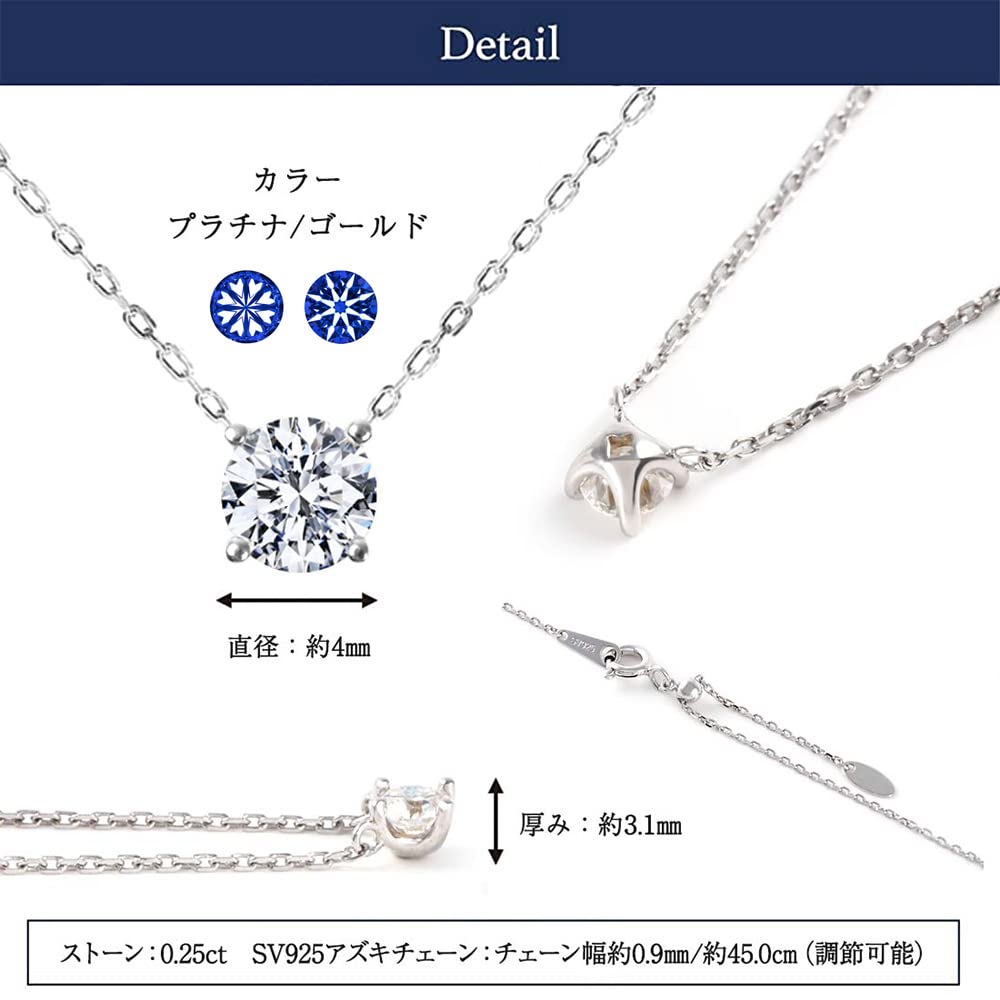 [Материалы и размер] Камень: Муассанит эквивалентный 0,25 карата, цвет D эквивалентный VVS1-IF, Верхний размер: Диаметр ок.. 4 мм/толщина примерно. 3,1 мм, Металл: Серебро SV925, Цвет: Платина/Золото, Цепь: Цепь Azuki, Общая длина: Максимум приблизительно. 45см (с бесступенчатой функцией свободного регулятора)