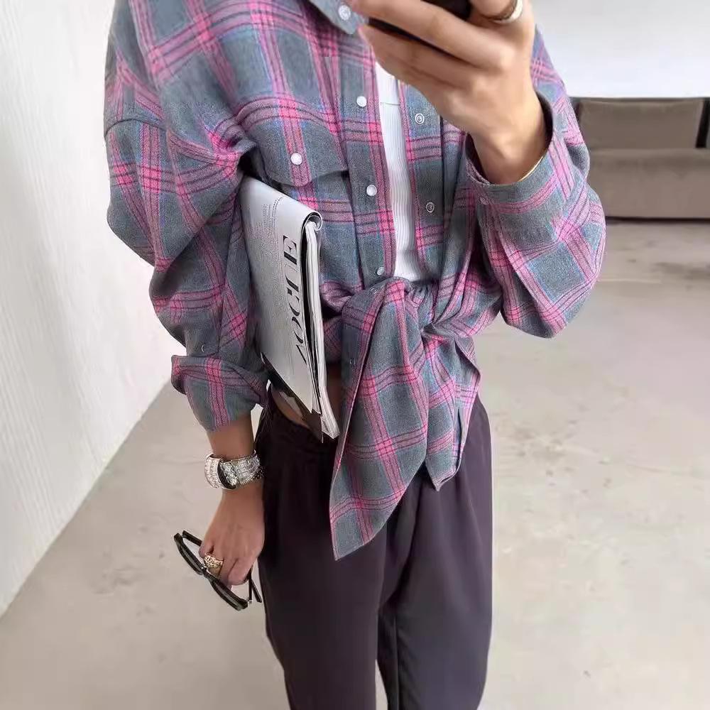 2024 Осень Женская Ретро Клетчатая Рубашка Свободного Отворота С Длинными Рукавами И Карманом — купить товар онлайн с бесплатной доставкой по всему миру!
