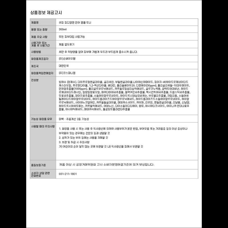 Ледниковая вода (дистиллированная вода), дипропиленгликоль, глицерин, бутиленгликоль, ниацинамид, гидрогенизированное касторовое масло ПЭГ-40, пропандиол, 1,2-гександиол, бетаин, полисорбат 20, ДНК (30 частей на миллион), полиглицерил-10 лаурат, экстракт икры лосося (1000 частей на миллион), полиглюкуроновая кислота, каприлоил салициловая кислота, глюконолактон, галактоарабинан, гидрогенизированный лецитин, масло цветков иланг-иланга, экстракт семян макадамии, экстракт семян черного тмина, экстракт семян мексиканской чиа, экстракт семян моринги, экстракт семян сафлора, экстракт цветков маргаритки, гиалуронат натрия, гидроксидецил убихинон, экстракт брокколи, ксилит, ацетилированный гиалуронат натрия, гидролизованная гиалуроновая кислота, гидролизованный гиалуронат натрия, гиалуроновая кислота, цианокобаламин, каприлилгликоль, мадекассосид, карбомер, лимонен, пентиленгликоль, линалоол, циннамаль, гидроксиацетофенон, каприловая кислота, аденозин, динатриевая соль ЭДТА, отдушка, азиатикозид, экстракт цветков арники горной, азиатиковая кислота, мадекассовая кислота, экстракт горца многоцветкового