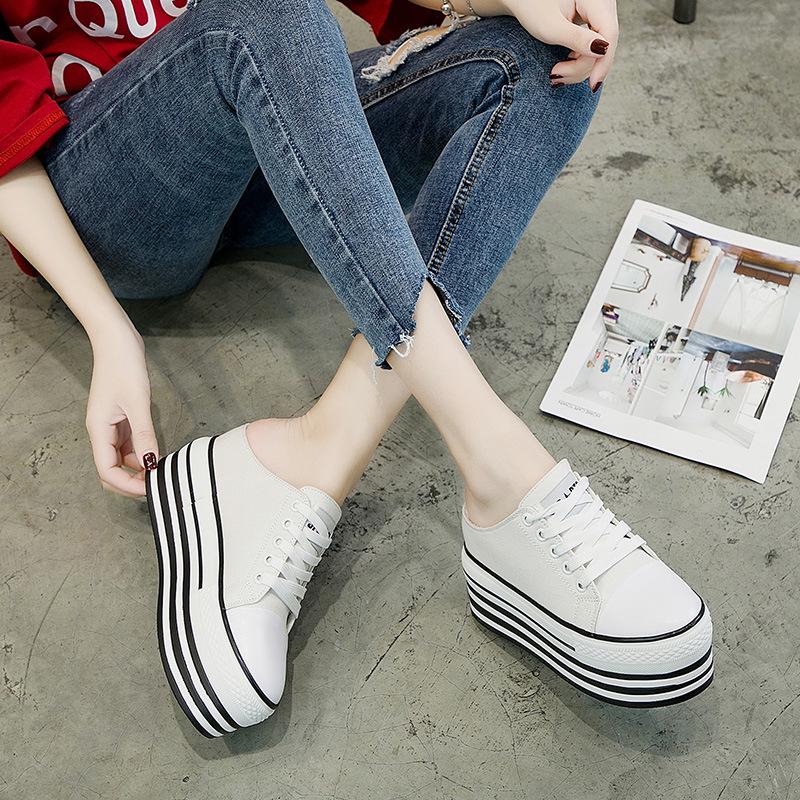 Новые женские парусиновые тапочки, увеличивающие рост: Повседневная обувь с круглым носком, шнуровкой и толстой подошвой для весны и лета