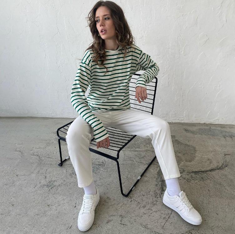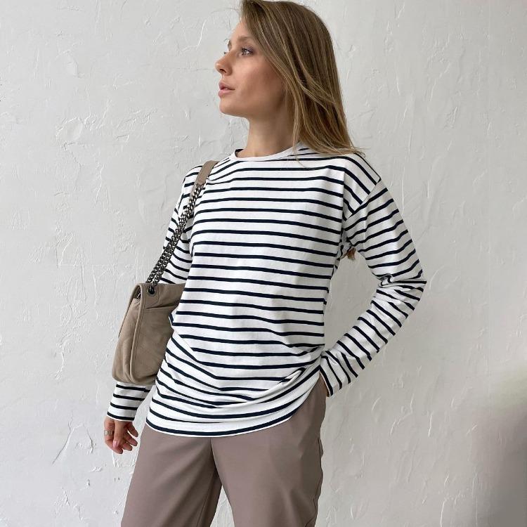 Женская летняя полосатая футболка с длинным рукавом и круглым вырезом Повседневный топ