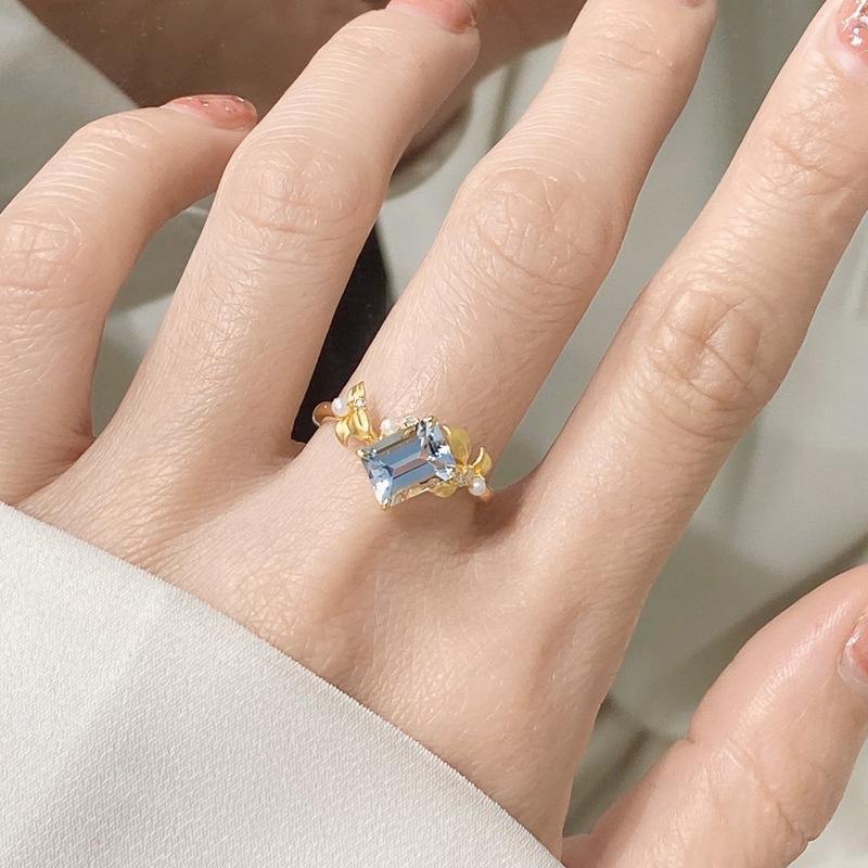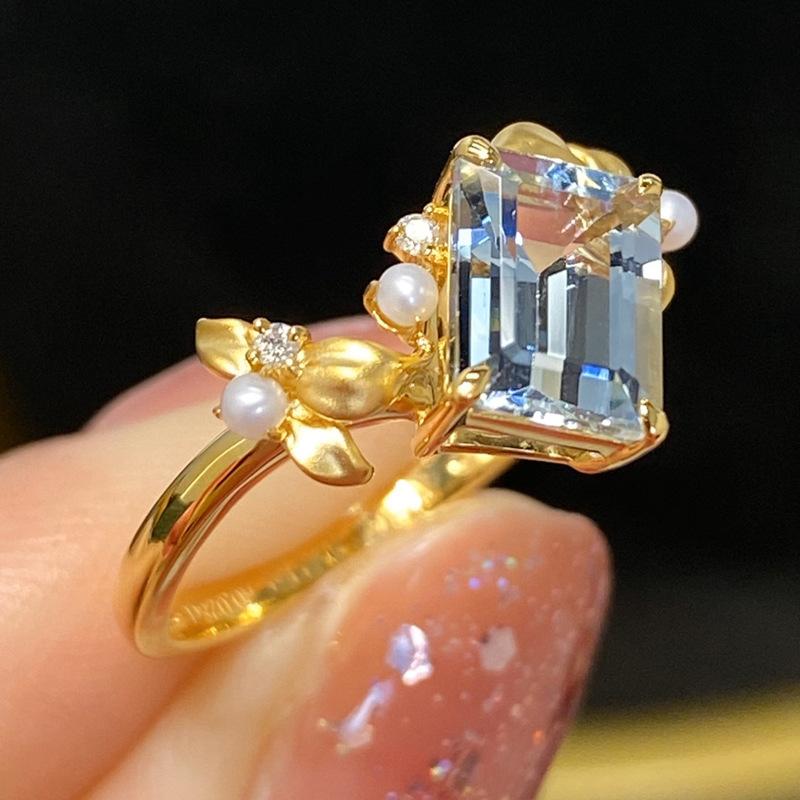 Кольцо-печатка Мода Имитация Натурального Жемчуга Покрытие 14к Желтое Золото Кольцо-цветок для Женщин Кольцо с Квадратным Голубым Топазом Подарок для Вечеринки