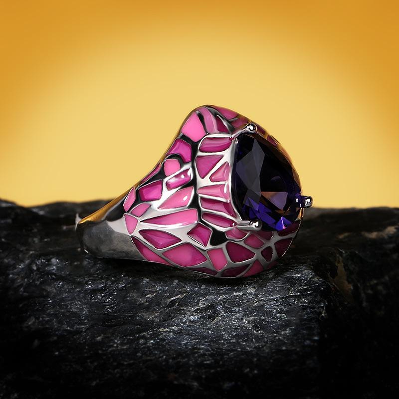 Серебряные женские украшения Темно-синее кольцо с большим цирконом Розовое эпоксидное неровное креативное женское изысканное ювелирное изделие Кольцо с эмалью ручной работы