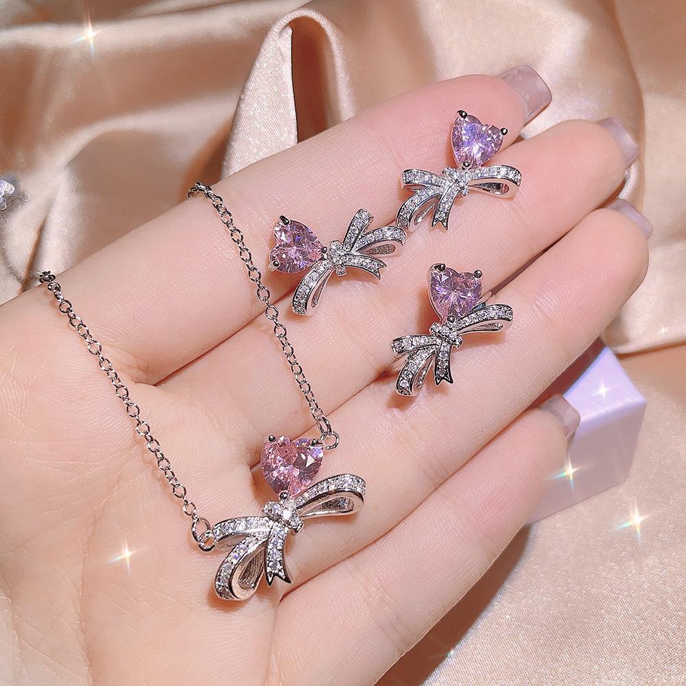 Модный розовый комплект ювелирных изделий из трех предметов с сердцем, бантом и цирконом для женщин, элегантное кольцо, ожерелье, свадебные комплекты ювелирных изделий для невест для женщин